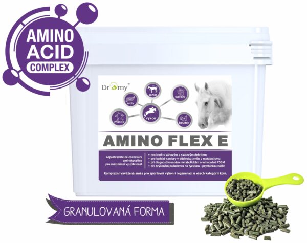 Amino Flex E je granulované doplňkové krmivo s obsahem esenciálních aminokyselin v koncentrované formě, určené pro všechny kategorie koní.