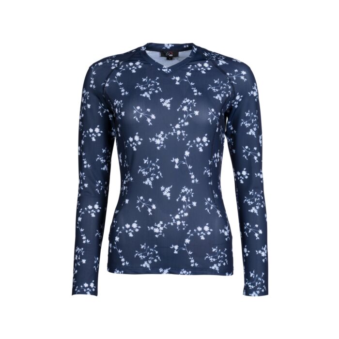 Elegantní, vysoce funkční triko s dlouhým rukávem a květinovým potiskem, navržené značkou HKM. Materiál je prodyšný, rychleschnoucí a elastický, přiléhavý střih lichotí postavě a zajišťuje volný pohyb. Malý výstřih do V dodává triku jemný ženský detail. Ideální volba pro jezdkyně i volnočasové nošení. Snadná údržba – praní na 30 °C, vhodné do sušičky.