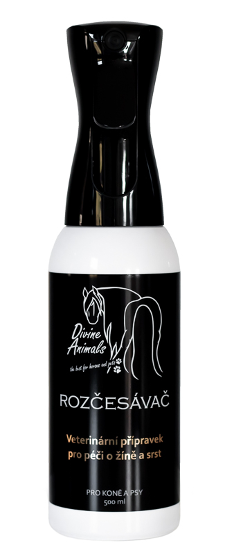 Velikost balení: 500 mlPro koně a psyBezoplachový kondicionér usnadňuje rozčesávání, vyhlazuje žíně a srst a působí antistaticky. Poaplikaci jsou žíně a srst hebké, lesklé a poddajné. Eliminuje ulpívání prachu na žíních a srsti. Příjemná levandulová vůně napomáhá odpuzovat hmyz.Rozprašovač funguje v jakékoliv poloze – i dnem vzhůru. Lahev s rozprašovačem neotevírejte před vypotřebením přípravku – ztratí tak svou funkčnost!Způsob podání: Naneste dostatečné množství přípravku na suché, nebo mokré žíně/srst, vmasírujte a poté rozčešte. Po zaschnutí doporučujeme znovu přečesat.Složení: Aqua, Dimethicone, Paraffinum Liquidum, Glycerin, Cetrimonium Chloride, Cetearyl Alcohol, PEG-40 Hydrogenated Castor Oil, Behentrimonium Methosulfate, Phenoxyethanol, Triethylene Glycol, Lavandula Angustifolia Oil, Beta-Caryophyllene, Geraniol, Geranyl Acetate, Camphor, Limonene, Linalool, Linalyl Acetate, Terpineol.Upozornění: Neaplikovat na otevřené rány a sliznice. Pouze pro zvířata. Před použitím vyzkoušejte na malé části pokožky. Nepoužívejte při známé přecitlivělosti na některou složku přípravku.Skladovací podmínky: V originálním obalu, v suchu, při teplotě +5 až +25°C a mimo dosah slunečního záření.Uchovávat mimo dohled a dosah dětí.Číslo schválení: 048-22/CDržitel rozhodnutí o schválení (výrobce): Divine Animals, s.r.o., Žibřidice 51, 463 53 Křižany, +420 723975 331, www.divineanimals.cz, info@divineanimals.cz, Česká republika
