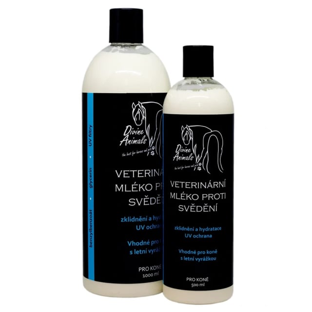 Veterinární přípravek pro koně se suchou kůží se sklonem k tvorbě lupů a svědění. Zmírňuje pocit svědění, zklidňuje, zvláčňuje a hydratuje namáhanou kůži. Mléko poskytuje pokožce UV ochranu. Vhodné pro koně s letní vyrážkou.Kompletní specifikace:Zklidnění a hydrataceUV ochranaVhodné pro koně s letní vyrážkou Způsob použití: Před použitím protřepejte! Naneste potřebné množství přípravku na postižená místa. Při letní vyrážce naneste před vypuknutím svědění na problematická místa. Z počátku doporučujeme používat 1-2x denně a po zlepšení stavu prodlužte interval mazání dle individuální potřeby koně (např. 2-3x týdně).Složení: Aqua, Benzyl Benzoate, Caprylic/Capric Triglyceride, Bis-Ethylhexyloxyphenol Methoxyphenyl Triazine, Diethylhexyl Butamido Triazone, Dipalmitoylethyl Dimonium Chloride, Diethylamino Hydroxybenzoyl Hexyl Benzoate, Glycerin, Cetearyl Alcohol, Ceteareth-20, Acrylates/C10-30 Alkyl Acrylate Crosspolymer, Parfum, Amyl Cinnamal, Benzyl Alcohol, Benzyl Salicylate, Citronellol, Dimethyl Phenethyl Acetate, Eugenol, Geraniol, Geranyl Acetate, Hexamethylindanopyran, Hexyl Cinnamal, Hydroxycitronellal, Limonene, Linalool, Linalyl Acetate, Terpineol.Upozornění: Pouze k vnějšímu použití, na kůži (nepoužívejte na otevřené rány a sliznice). Nepoužívejte při známé přecitlivělosti na některou složku přípravku. Před použitím vyzkoušejte přípravek na malé části kůže (může způsobit podráždění). Nepoužívejte u březích klisen nebo se poraďte s veterinárním lékařem. Pouze pro zvířata. Po manipulaci důkladně omyjte ruce vodou, stejně jako potřísněné části pokožky. Při požití nebo necítíte-li se dobře volejte ihned lékaře. Doporučujeme používat ochranné rukavice.Skladování: V originálním obalu, skladovaném na suchém čistém místě při teplotě +5 až +25 °C a mimo dosah přímého slunečního záření. Odpad likvidujte podle místních právních předpisů.Uchovávejte mimo dohled a dosah dětí!Datum exspirace/číslo šarže: uvedeno na obaluČíslo schválení: 299-25/CDržitel rozhodnutí o schválení (výrobce):Divine Animals, s.r.o., Žibřidice 51, 463 53 Křižany, +420 723 975 331, info@divineanimals.cz, www.divineanimals.czZemě původu: Česká republika