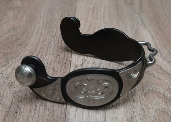 Krásné, kvalitní westernové ostruhy z černé oceli, zdobené rytím.Rozteč: 7cm